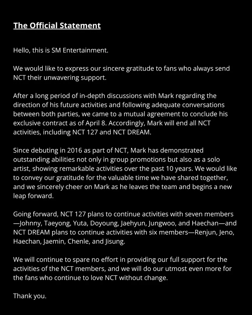 According to the agency, the decision came after “a long period of in-depth discussions” regarding the direction of Mark’s future activities. The company also expressed gratitude for the past 10 years, highlighting his impact both as a group member and solo artist.