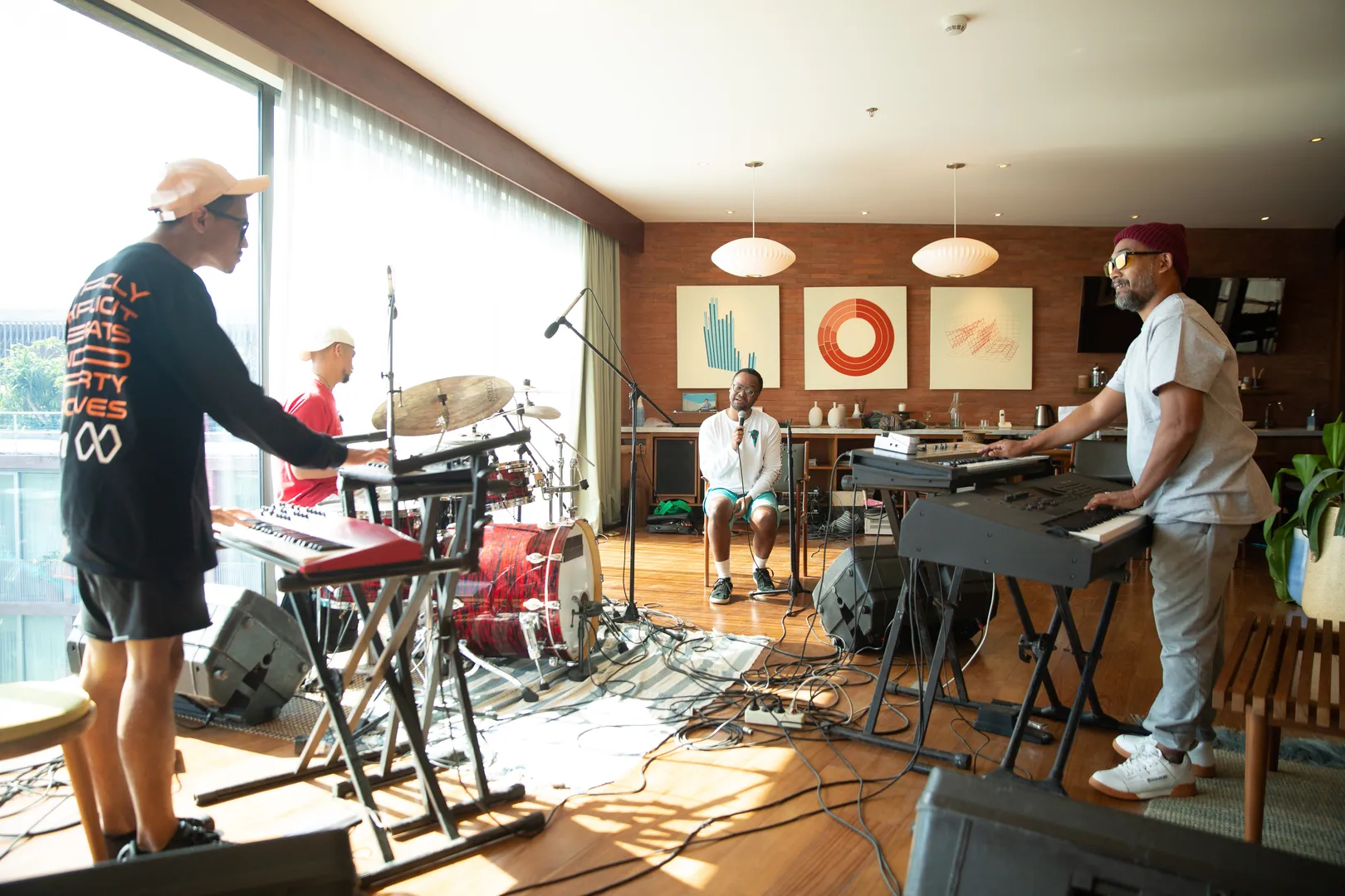 They set up a temporary studio at the Katamama Suite, top floor… big glass windows, ocean view, sunset right in front of us. It was surreal. Huge love to Dea Barandana and Pete Keen for making that happen. We heard the only other artists who had recorded in that space were Disclosure and Erykah Badu, so we felt honored to be part of that energy.