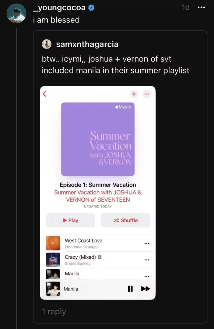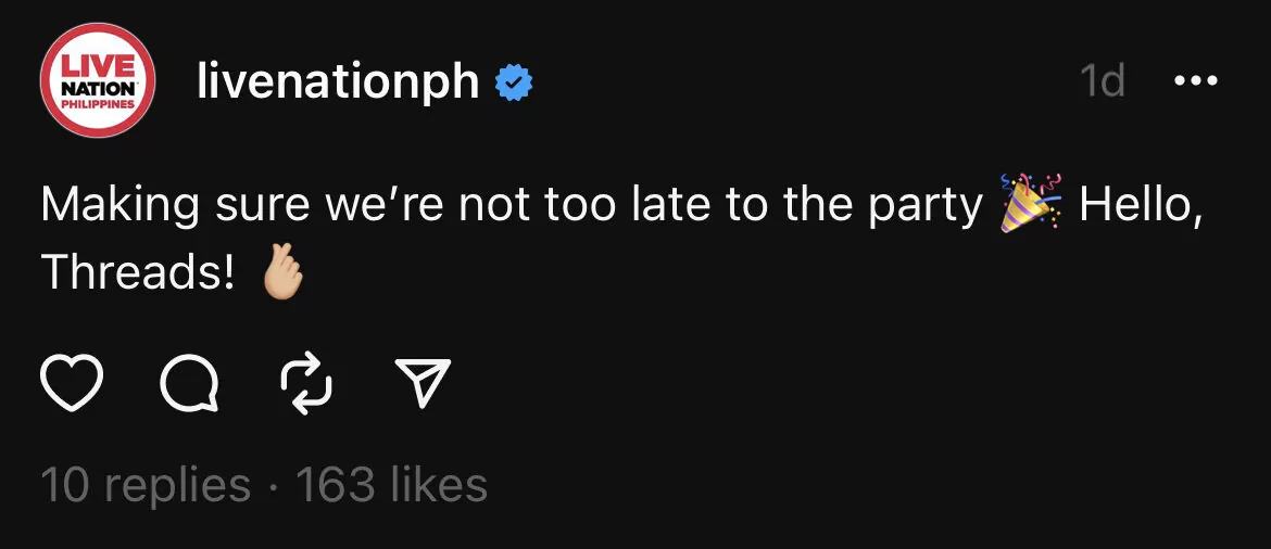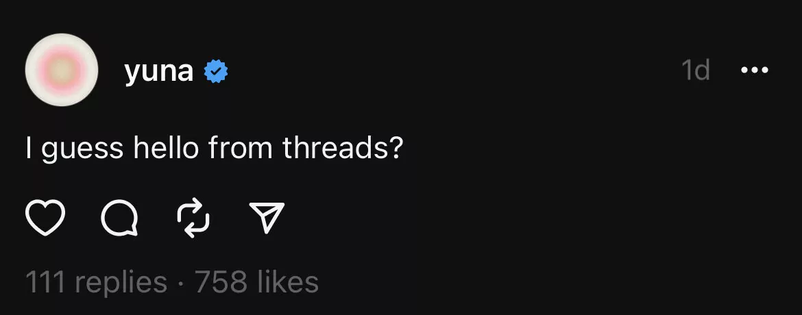 Some of our favourite artists have already opened their own Threads accounts such as GOT7's Mark Tuan and Jay B, GRAMMY-winning popstar Olivia Rodrigo, Filipino folk-pop act Ben & Ben, Thai pop group 4 Eve and indie rock trio Tilly Birds, Vietnamese-American musician keshi, Singaporean singer-songwriter Shye, NCT's Mark, Taeyong, Haechan, and Jaemin, Japanese music super duo Yoasobi, Korean-American singer-songwriter and Twitch streamer eaJ, Malaysian pop star Yuna, SB19 members Stell and Josh, PLEDIS Entertainment act and Prismfilter producer BUMZU, and more.