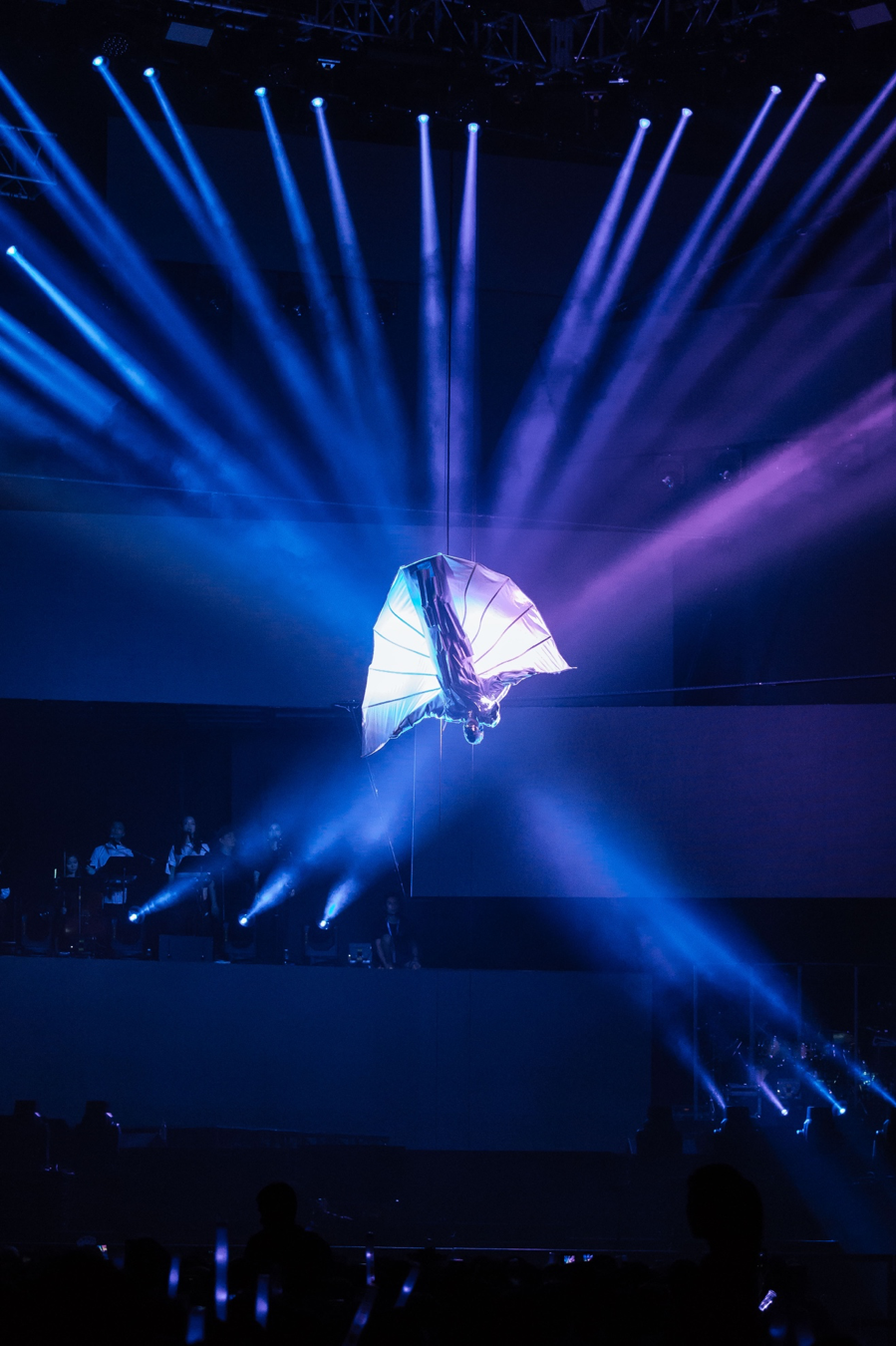 JJ一开场就以悬空半吊的姿势出现,空中倒吊演唱《一千年以后》。带着面具和头罩的他,边唱边把缠着身体的服装慢慢打开,展开一双翅膀,把观众带入他的圣所。