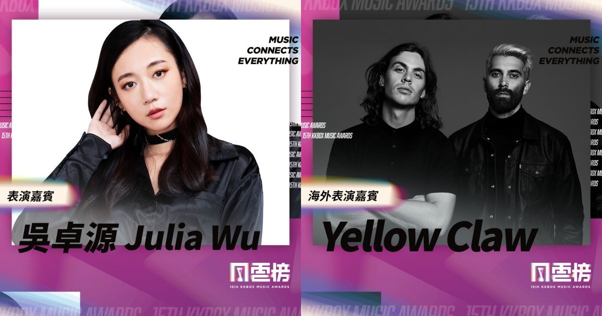 荷兰电音界超坏男子天团 Yellow Claw由Jim和Nils组成,以陷阱(Trap)、嘻哈(Hip-hop)和硬派(Hardstyle)等多元的曲风和超炸的现场演出著称,预告将在风云榜舞台上首次公布与 R&B 新生代女神 Julia 吴卓源合作的全新作品,连手用电音轰炸台北小巨蛋!。