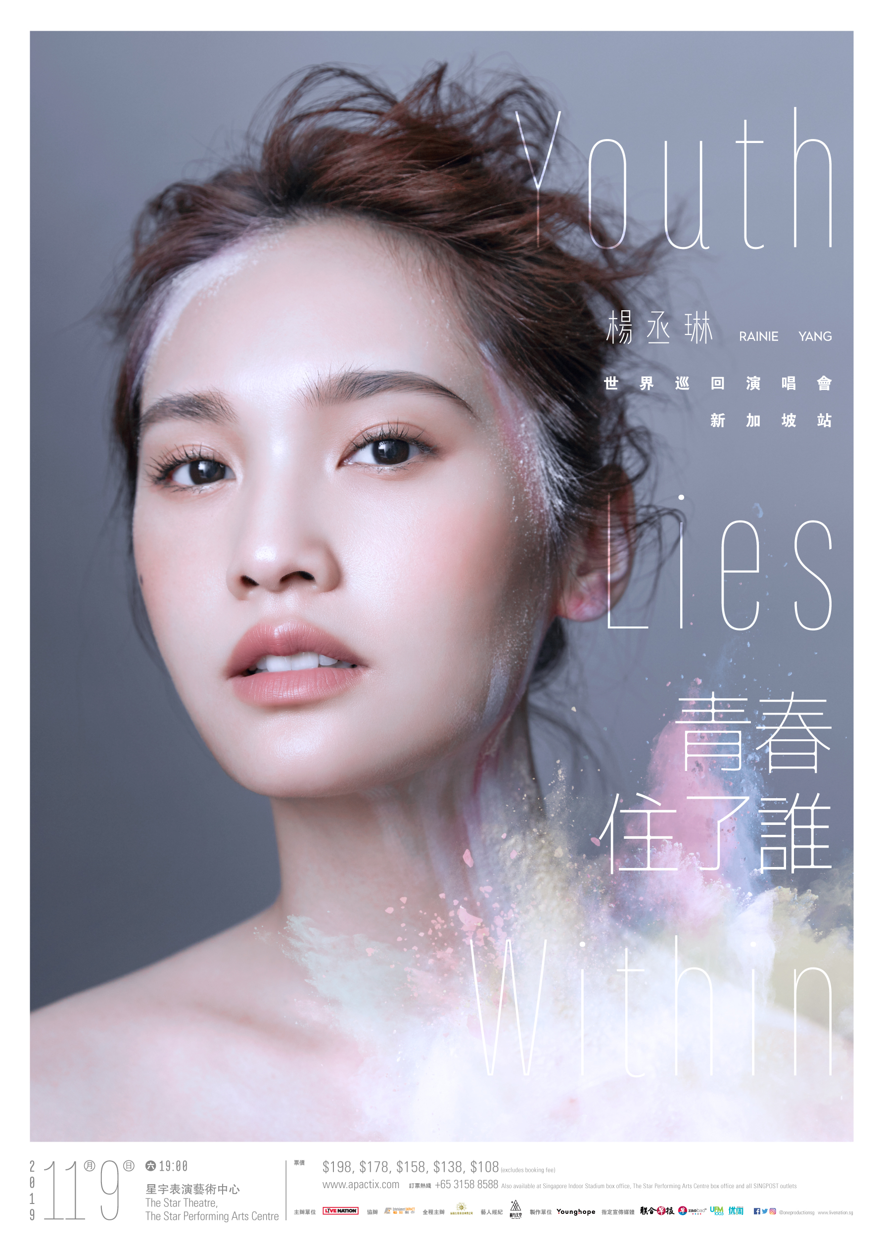杨丞琳《青春住了谁》世界巡回演唱会新加坡站将于11月9日(星期六)晚上7点在星宇表演艺术中心The Star Theatre举行。票价定于$198,$178,$158,$138,$108,会在8月14日(星期三)早上10点于APACTix正式公开发售。Live Nation会员可在8月13日(星期二)优先购票。欲知更多详情,请游览Live Nation Singapore或是上ONE Production脸书查询。