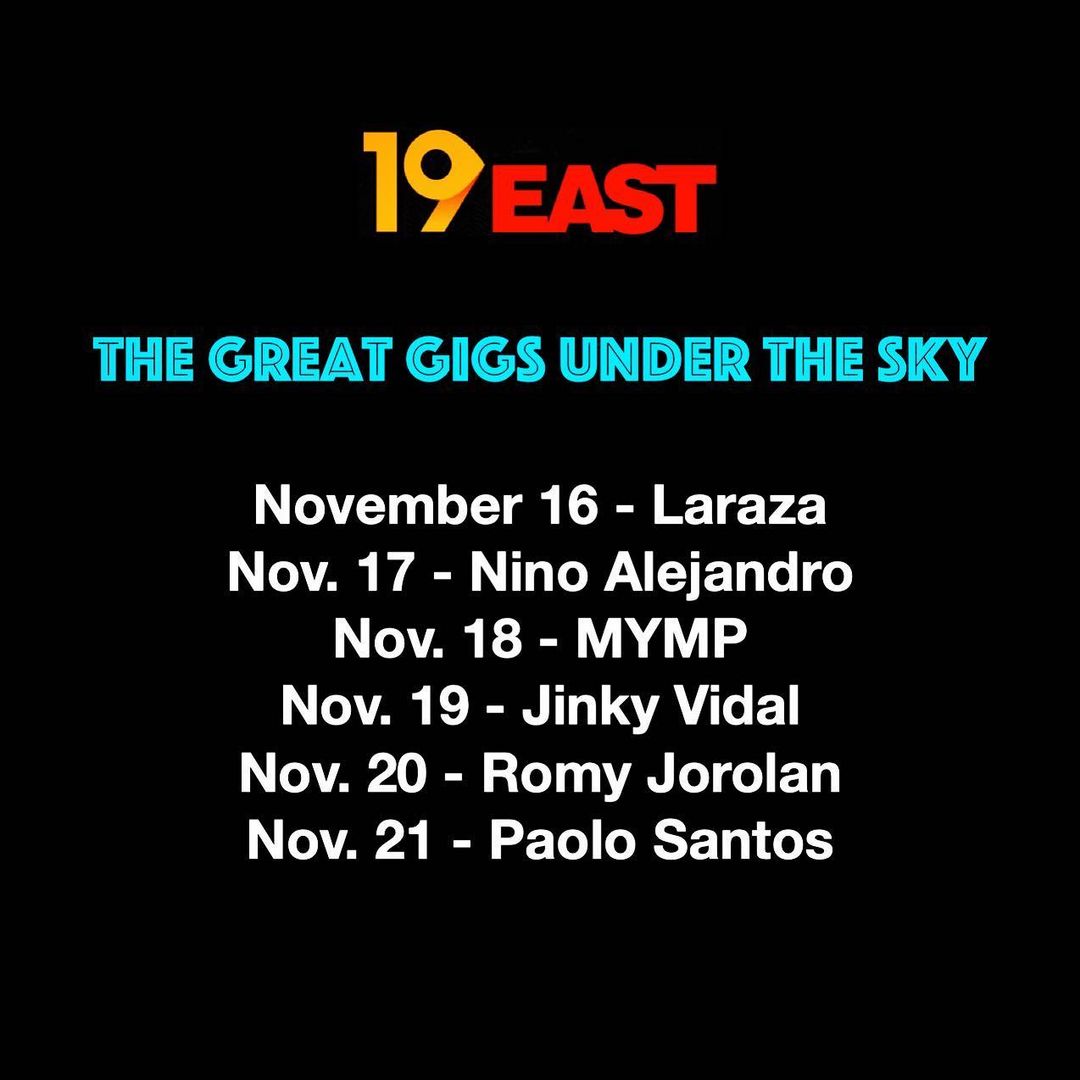 On Monday (15/11), the live music venue along East Service Road in Sucat announced its acoustic shows for this week, starting Tuesday to Sunday. The shows, featuring the likes of MYMP, Jinky Vidal, Paolo Santos, and more, will be held at 19 East's al fresco dining area.