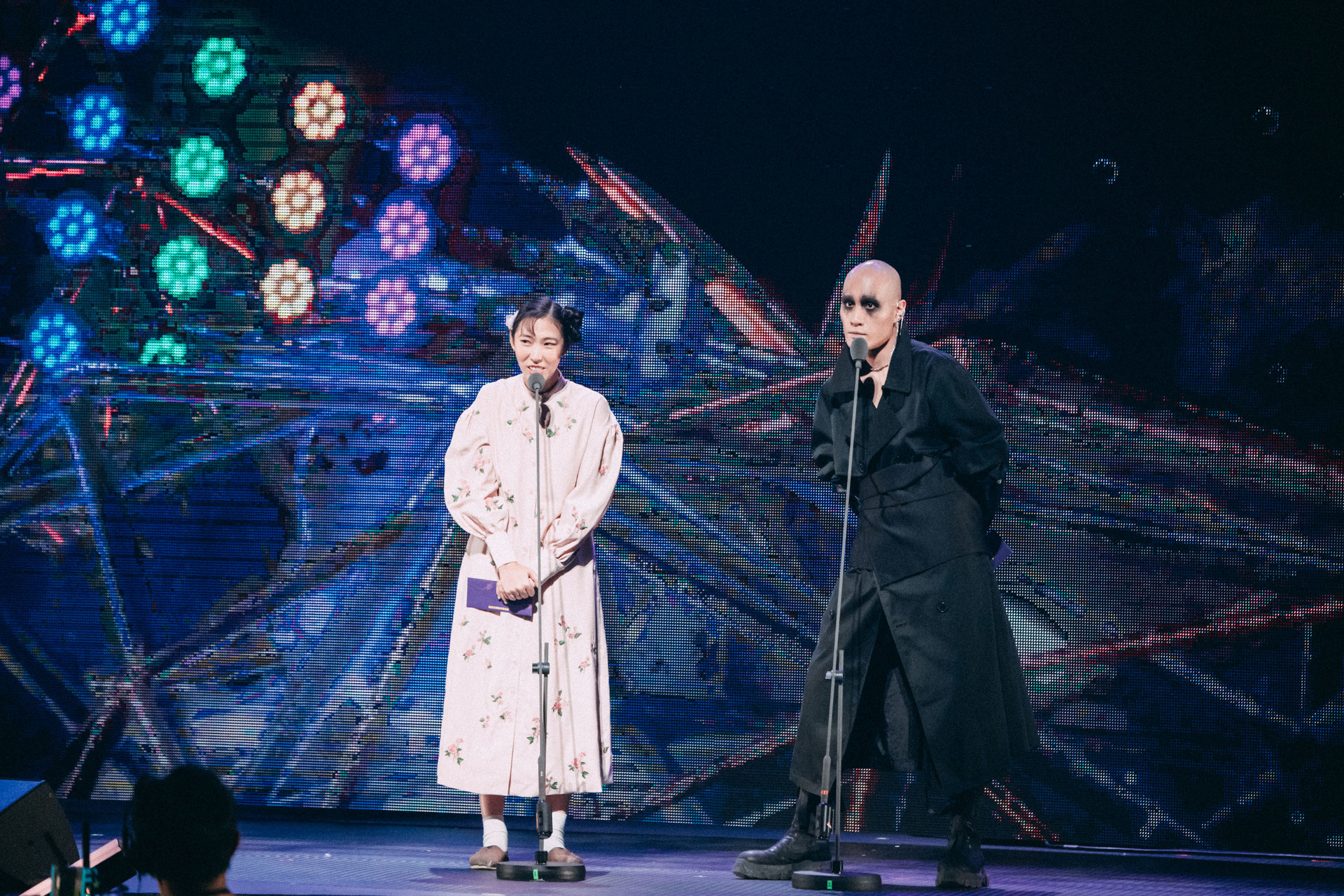 王若琳与YELLOW黄宣以黑白双煞之姿登场,一起揭晓去年才新增的另类流行歌曲奖项,他们各自以「每个时代的流行都是做出别人没做过的事」、「在创作的时候不会给出一个明确的答案」,用自身的见解,解读了所谓了「另类」。