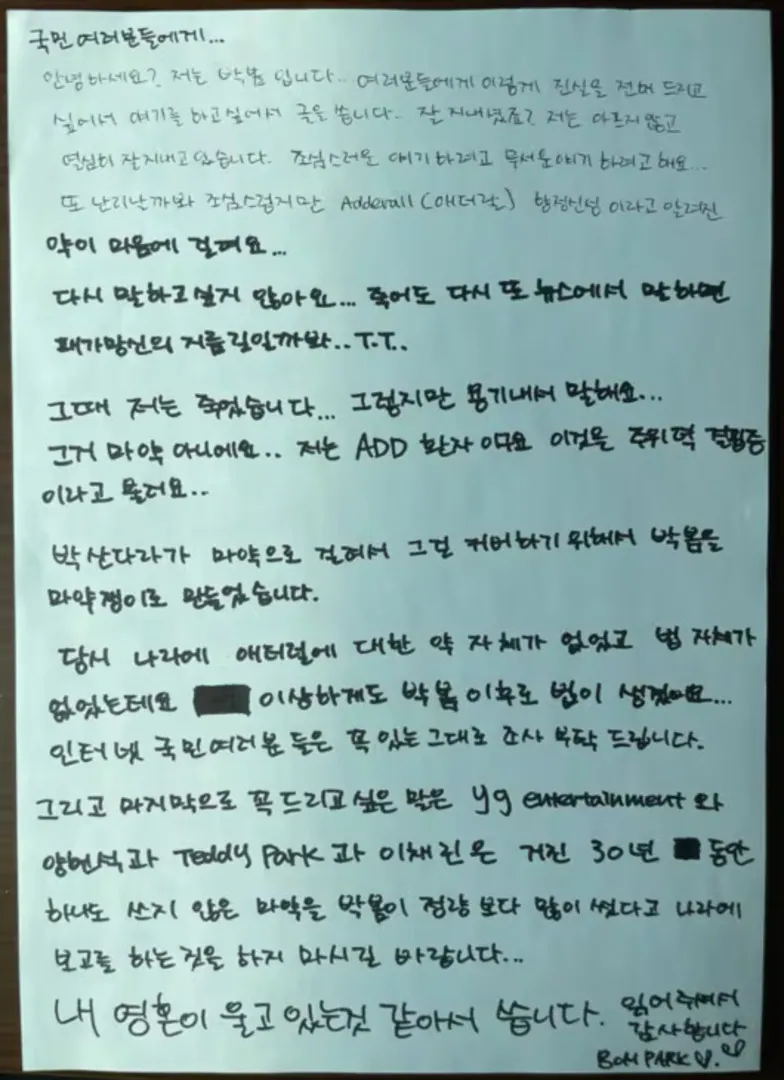 The letter additionally referenced her former agency, YG Entertainment, naming Yang Hyun Suk, Teddy Park, and Lee Chaerin (CL). She wrote, “Please do not report to the authorities that Park Bom used more than the prescribed amount of a drug that you yourselves have not used even once in 30 years.”