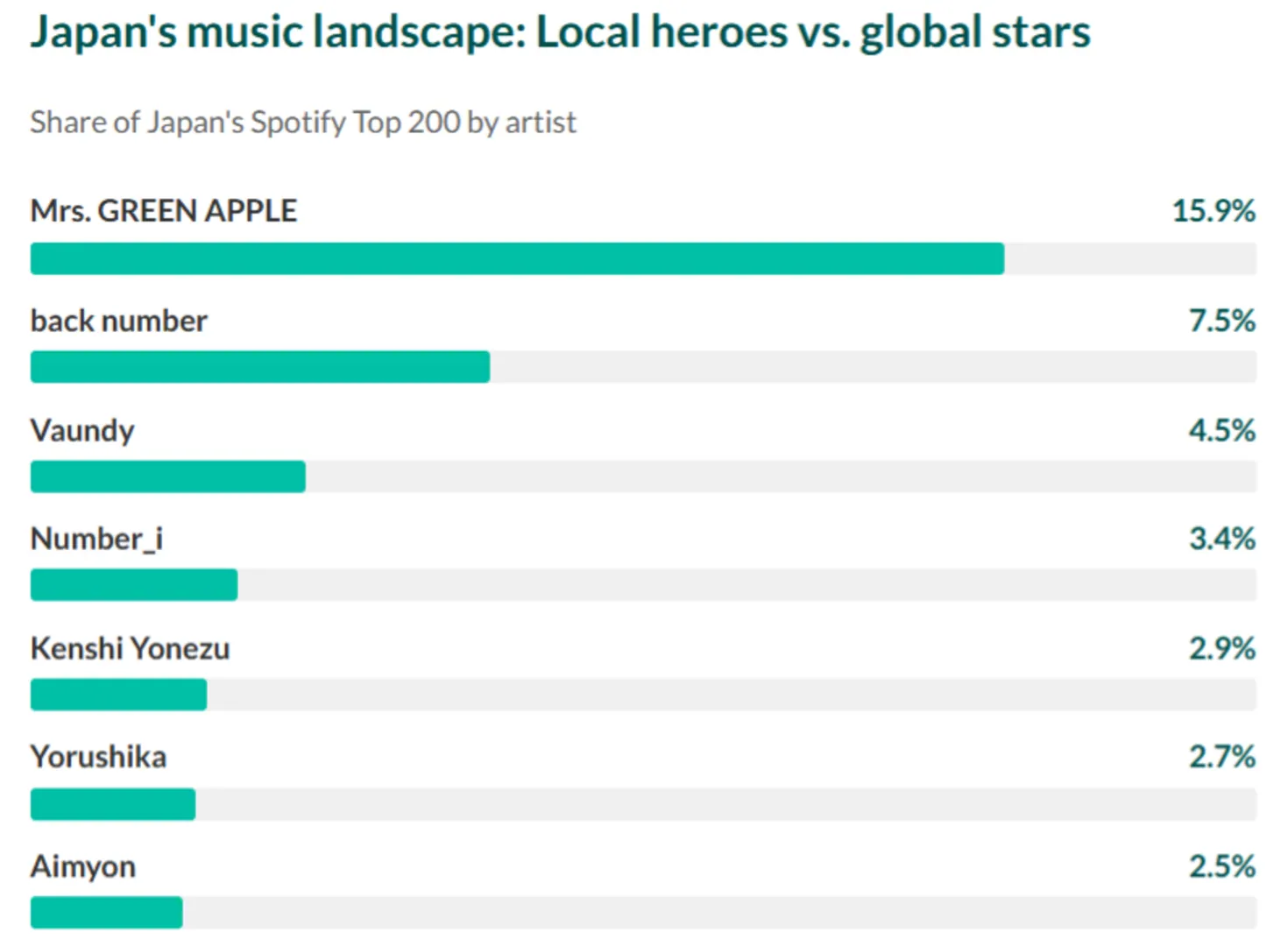 While international superstars dominate Spotify charts elsewhere, Japan marches to its own beat. Japanese acts like Mrs. GREEN APPLE, back number, Vaundy, Kenshi Yonezu, and YOASOBI consistently top the local charts. In fact, Mrs. GREEN APPLE alone accounted for nearly 16% of all chart appearances during the study’s snapshot — a rare concentration of success that highlights just how strong homegrown talent is in Japan.