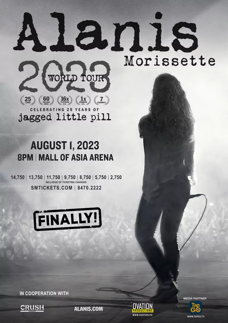 Morisette's 2023 Manila concert is presented by Ovation Productions. Gates to the show open at 8:00 PM. Tickets are available via SM Tickets. Prices range from PHP 2,750 to PHP 14,750.