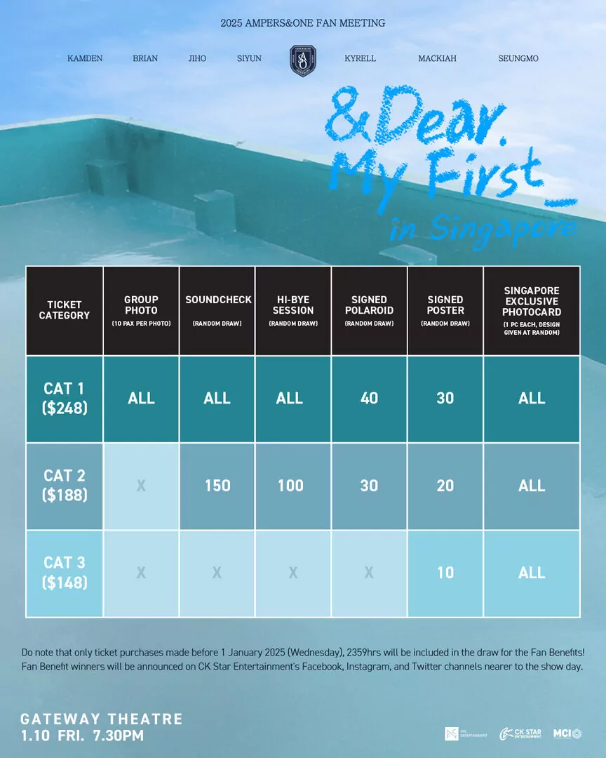 AMPERS&ONE fans, known as “ANDEAR,” can anticipate a memorable evening on 10 January as the group connects with their Singaporean fanbase. Ticket categories include CAT 1 ($248), CAT 2 ($188), and CAT 3 ($148). Special fan benefits are available for tickets purchased before 1 January 2025.