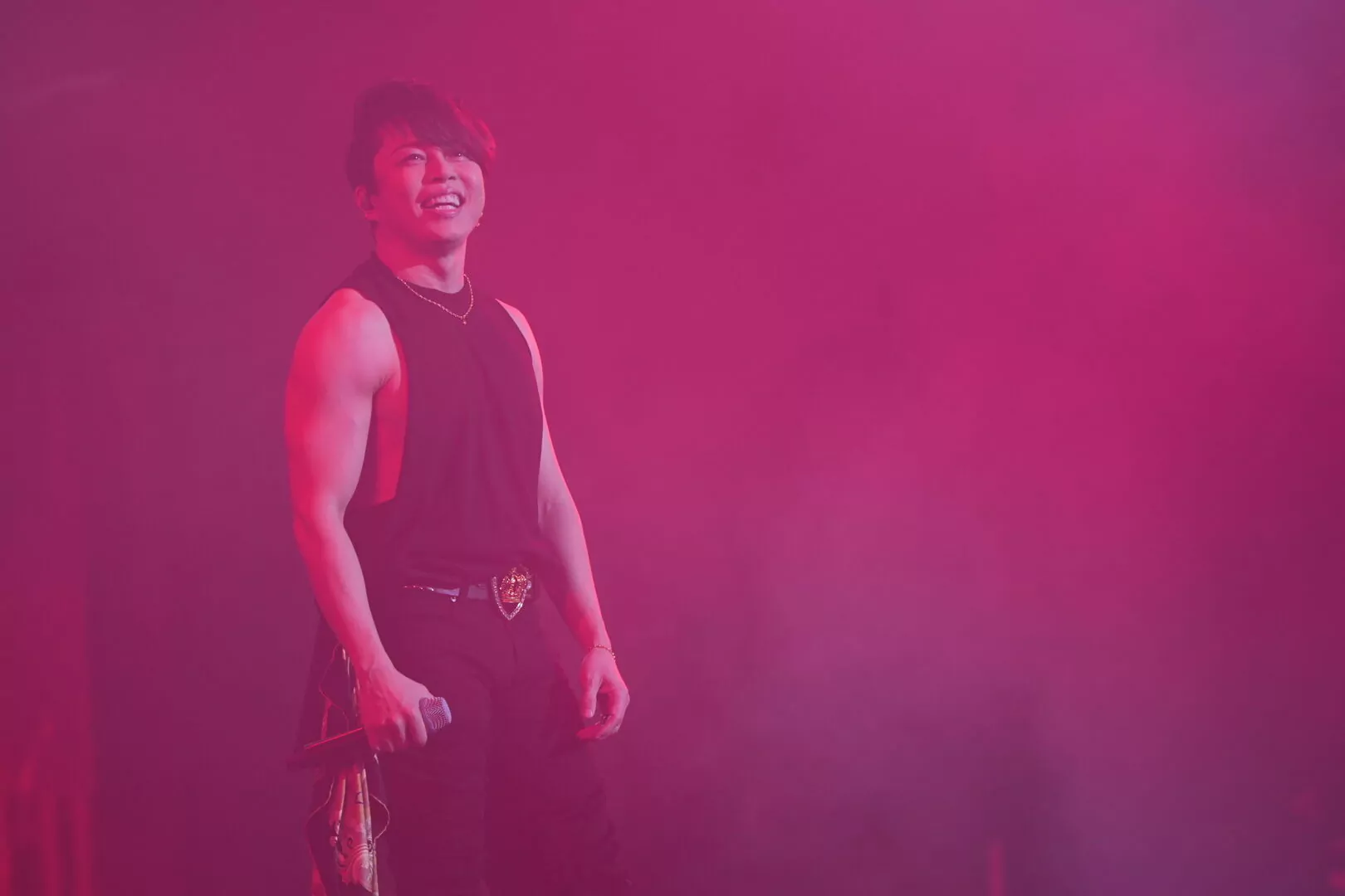 Later on, Shouta Aoi appeared once again. He energetically ran across the stage with a powerful performance of 'Zessei Stargate'. Without missing a beat, he went on to perform 'BAD END', an edgy number that further excited the audience. During the MC segment, he smiled and said, "This isn't one of my songs, but I've prepared a song that I want to sing with everyone." As the intro to 'Butter-Fly', the theme song from the highly popular anime Digimon Adventure began to play, the venue erupted in cheers. When the chorus came, Aoi pointed the microphone towards the audience, prompting a massive sing-along.