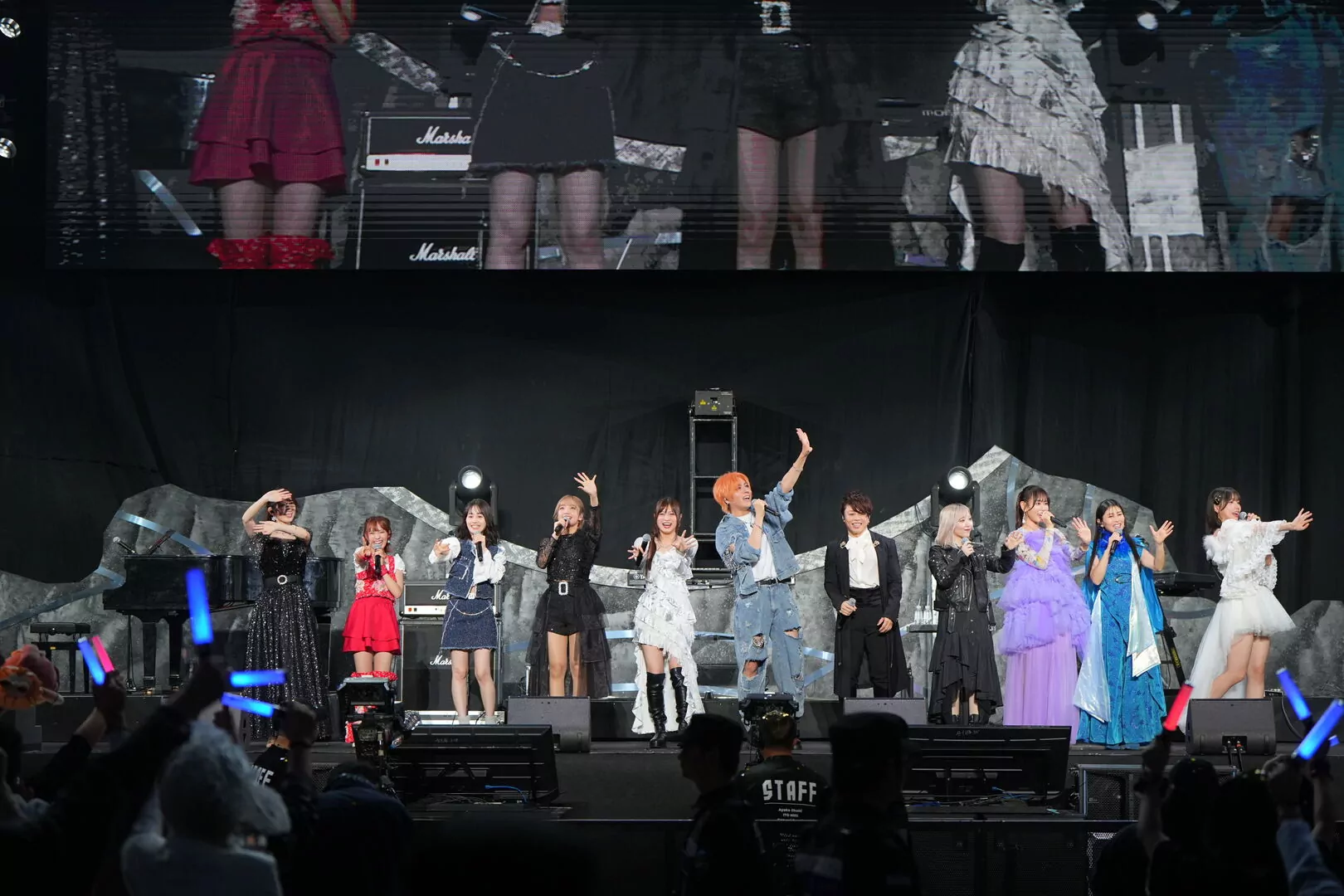 TRUE was the next to take the stage, performing 'Frozen' with scenes from Wistoria: Wand and Sword playing in the background. The gentle sound of the acoustic guitar brought a new atmosphere to the venue. In the following song, 'Sincerely', she stood by the piano and stunned the audience with her remarkable vocal ability. After performing 'ReCoda', which she introduced as a song filled with her passion for music, she invited a special guest, ReoNa, to join her. Together, they delivered a performance of 'Independence'. TRUE's fiery, passionate expression contrasted beautifully with ReoNa's calm and serene voice, creating a striking contrast that moved the audience deeply.