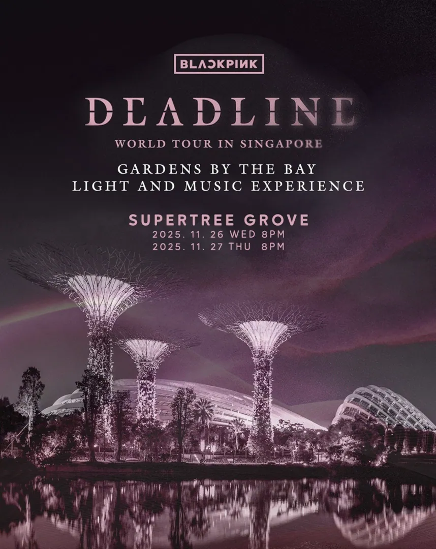 Don't miss the chance to watch as the beautiful night sky shines with a bright pink radiance as the Supertrees glow in a luminous pink shade, while playing BLACKPINK’s biggest hits — including 'Kill This Love,' 'Forever Young,' and 'JUMP.' Celebrate the countdown to the upcoming shows with the BLACKPINK WORLD TOUR <DEADLINE> IN SINGAPORE X GARDENS BY THE BAY LIGHT & MUSIC EXPERIENCE taking place on 26 and 27 November at 8 PM — offering a stunning showcase that fuses light, sound, and energy.