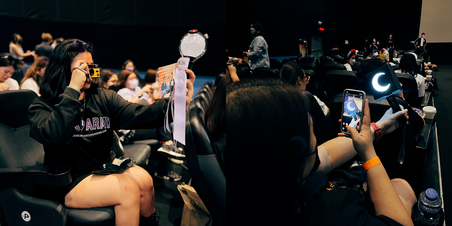 Volunteers for the screening give fellow ARMYs warm welcomes before entering the cinema.