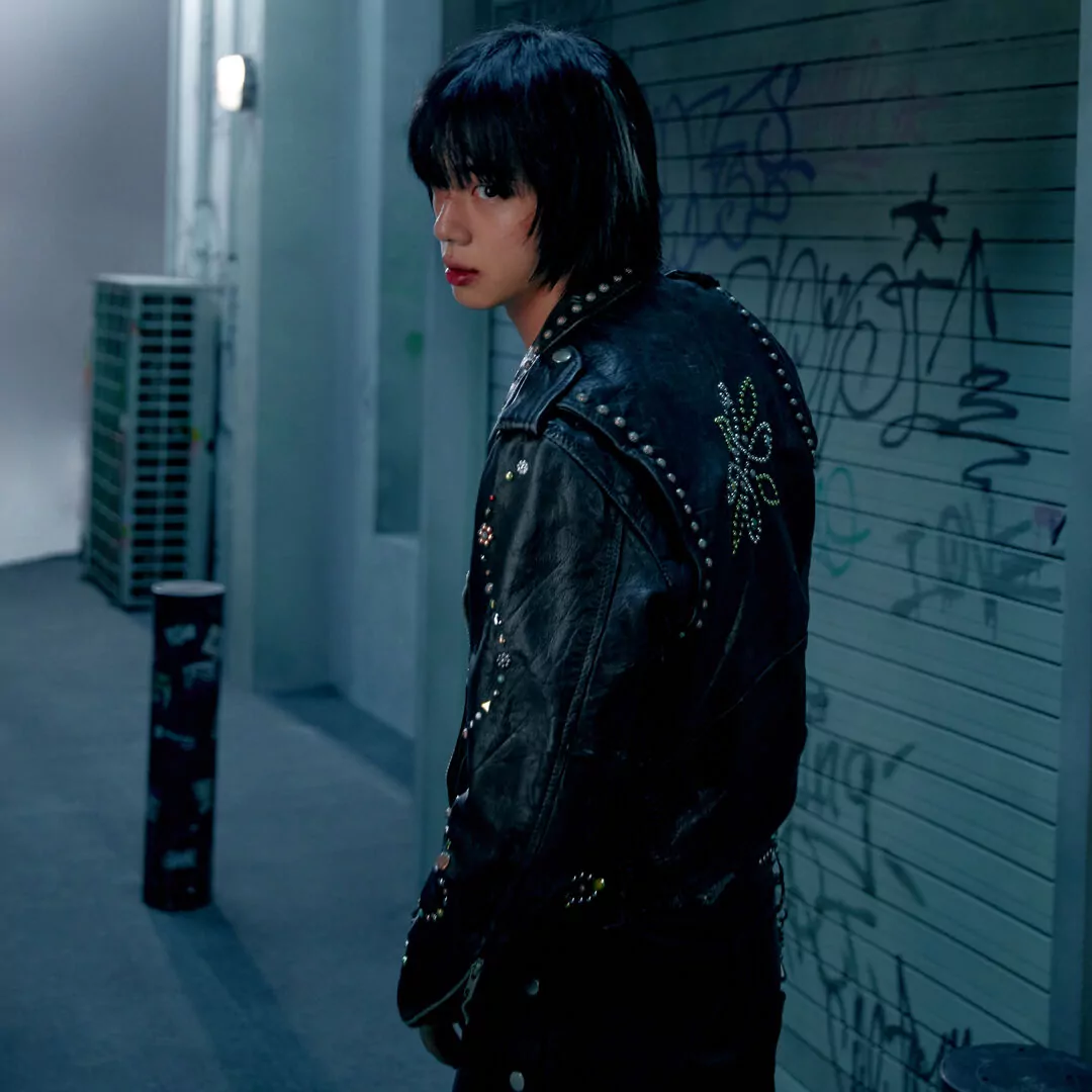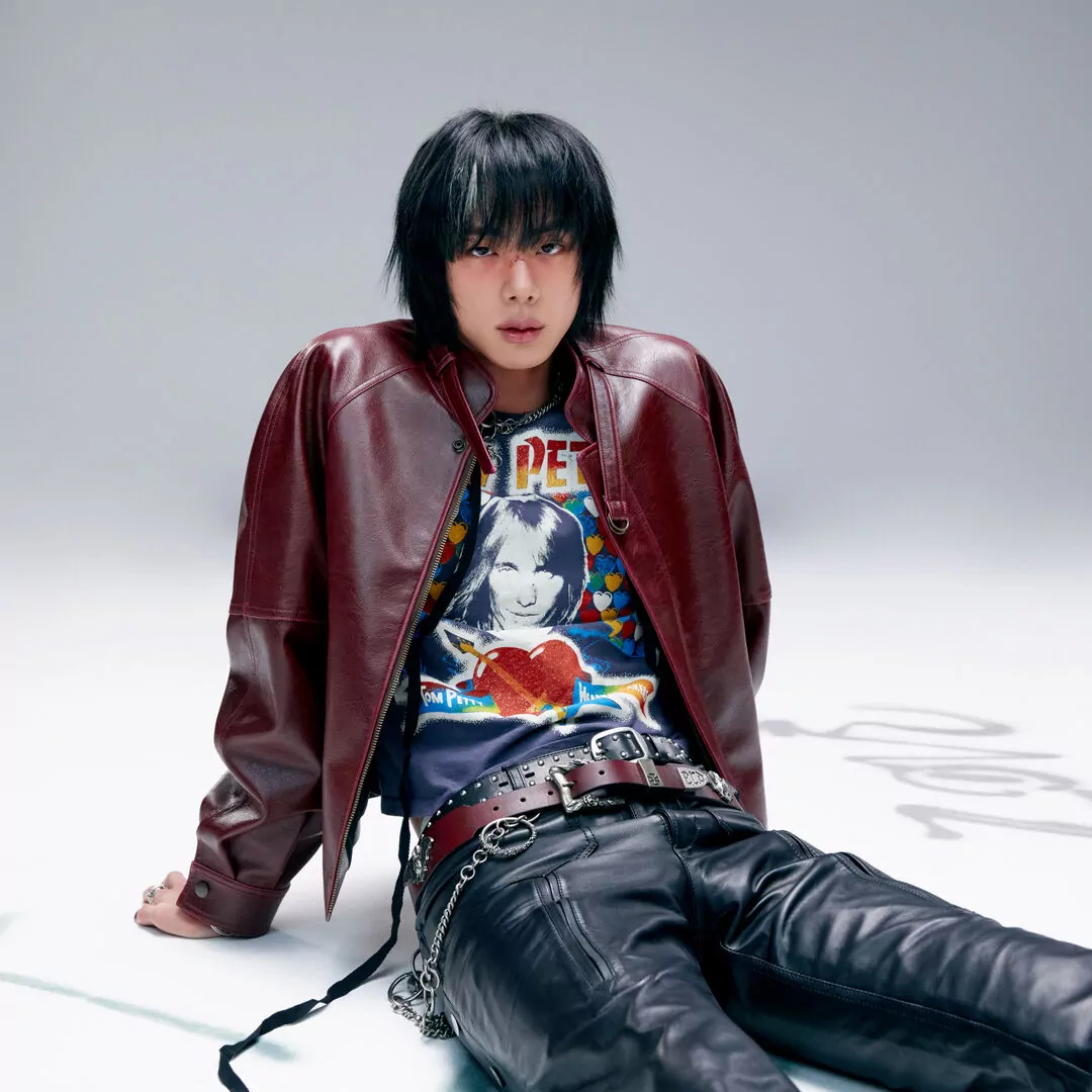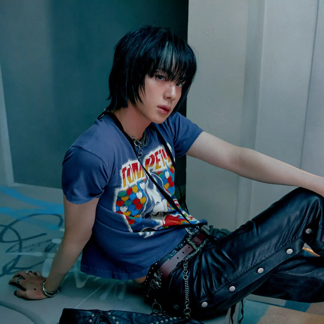 The second set of concept photos, unveiled the following day, channels the spirit of a rock icon. Jin appears in a punk rock-inspired outfit, featuring a leather jacket, matching pants, and a studded belt and accessories, paired with medium-length hair streaked with blonde highlights. Posing confidently against a graffiti-covered backdrop, he commands attention with a striking sense of individuality and a rebellious edge.