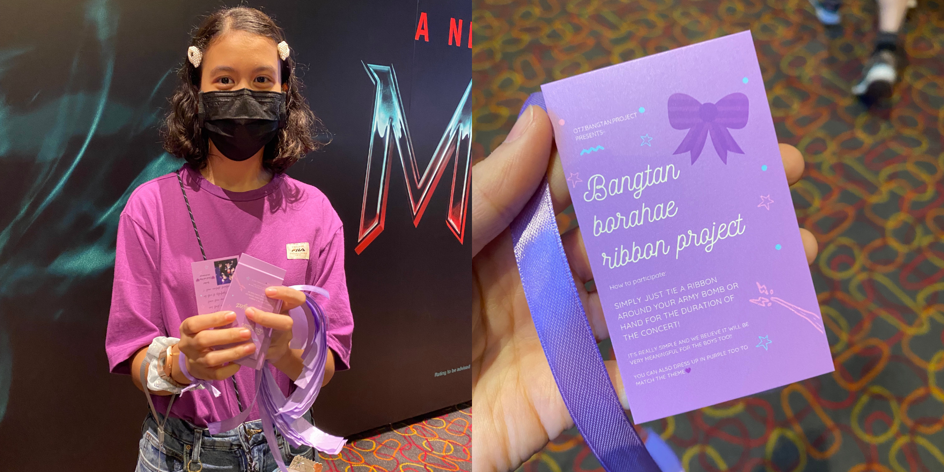 8:48PM While waiting for our turn to get checked — A fan approached each person in the queue handing them a ribbon and note card for the Bangtan borahae ribbon project.