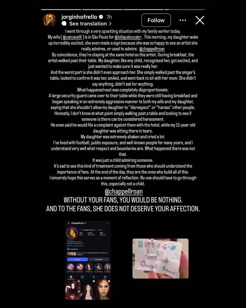 According to Jorginho, his daughter — excited to spot an artist she admired — briefly walked past Roan’s table to confirm it was her, without speaking or asking for anything. He claimed that shortly after, a security guard approached their table and reprimanded them, accusing the child of being disrespectful and even threatening to file a complaint with the hotel.