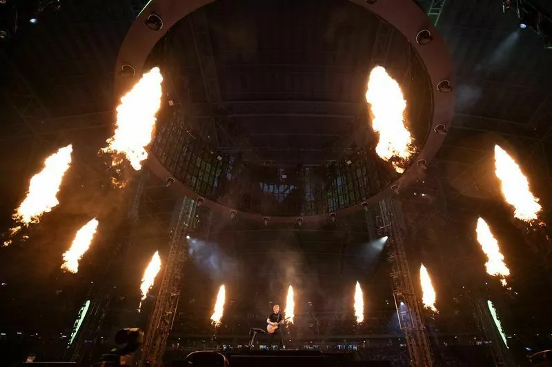 Right in the heart of the stadium, stood an intriguing circular stage that drew our attention. Positioned at four corners of the stage were screens shaped like guitar picks, and a circular LED screen that hovered above the stage, showcasing a panoramic sight of the striking red visuals from Sheeran’s = (2021) album.