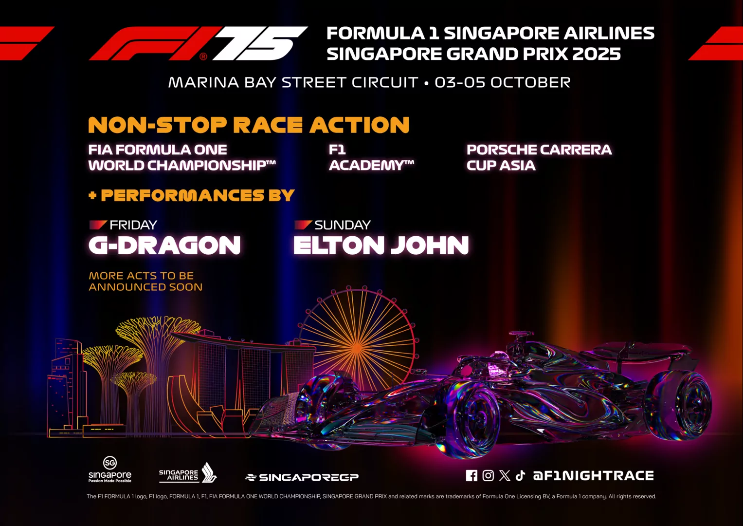 Superstar K-pop G-DRAGON akan kembali ke Singapura pada hari Jumat, 3 Oktober, di Padang Stage di Zone 4 untuk mengawali balapan akhir pekan. Sementara itu, Elton John akan menutup akhir pekan balapan pada hari Minggu, 5 Oktober di Padang Stage di Zone 4.
