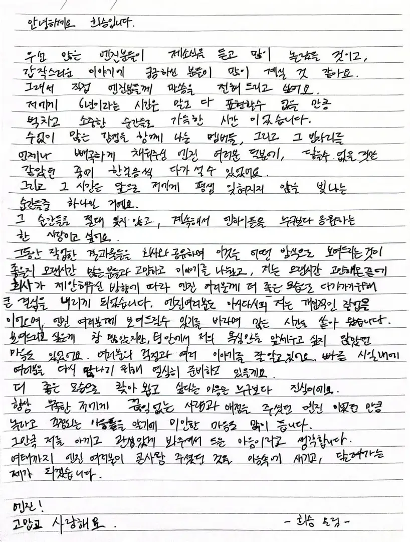 Shortly after the announcement, the singer also addressed fans directly through a handwritten message on the fan platform Weverse. In the note, he acknowledged the shock the news may have caused and expressed gratitude for the continued support he has received throughout his career. He reassured supporters that he intends to work hard on new music so he can return with fresh projects soon.