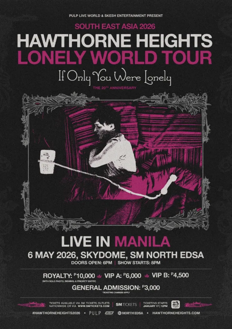 Get ready for a night like no other as HAWTHORNE HEIGHTS announce that they will be holding their first-ever performance in Manila on 6 May as part of their Only You Were Lonely 20th Anniversary Tour. Being held at the Skydome, SM North EDSA, this historic show is bound to get emo and alternative rock fans pumped for a night of celebrating the 20th anniversary of the legendary If Only You Were Lonely album.