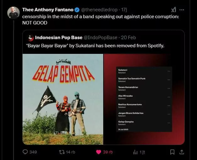 He further warns of the broader implications of this development as freedom of expression is guaranteed under Indonesia's human rights laws, "Artistic expression is a form of free speech and should not be limited. Like this song, critical works play a crucial role in democratic discourse.”