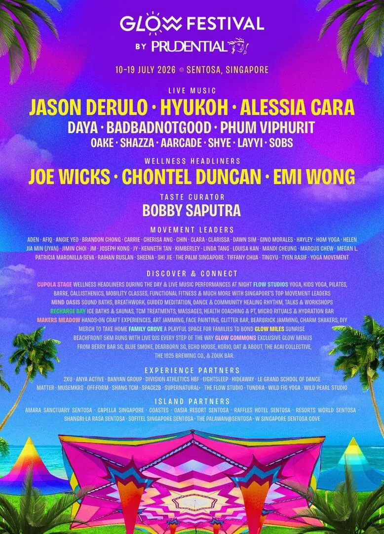 Glow Festival by Prudential is back once again from 10 to 19 July, boasting an even greater roster of amazing regional and international live music acts and over 70 wellness sessions across six immersive festival zones. Being one of Singapore's greatest lifestyle festivals, the 2026 installment of the festival is set to be one of the most exciting editions to date.