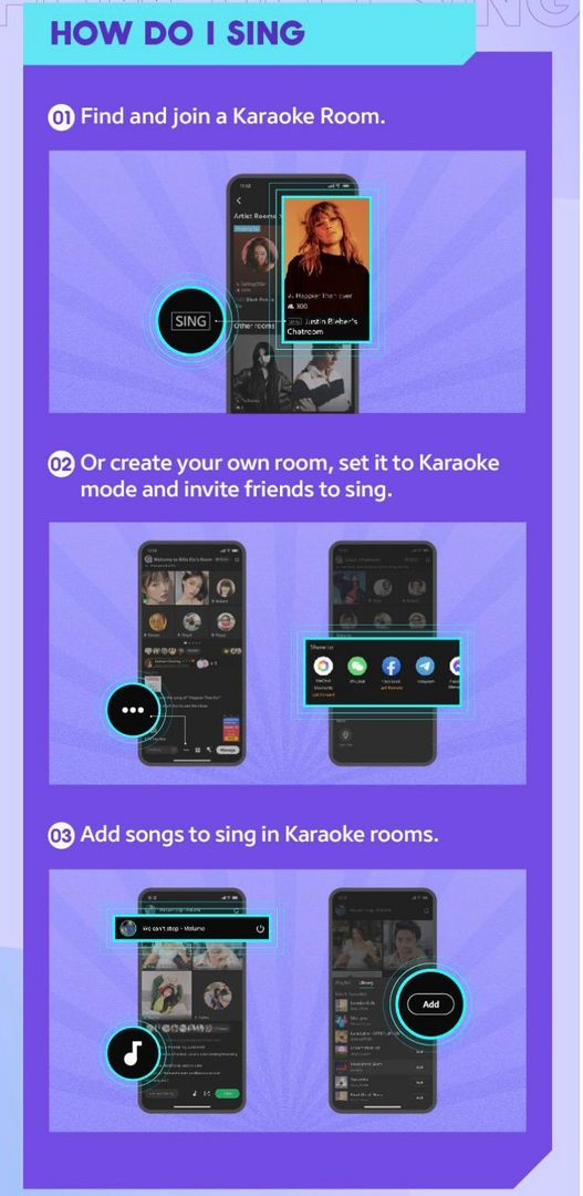 Each room has up to 50 songs, with up to 3 songs per person, and Room hosts can switch from chat mode to Karaoke mode to let the music begin and invite anyone to sing a solo or a duet.