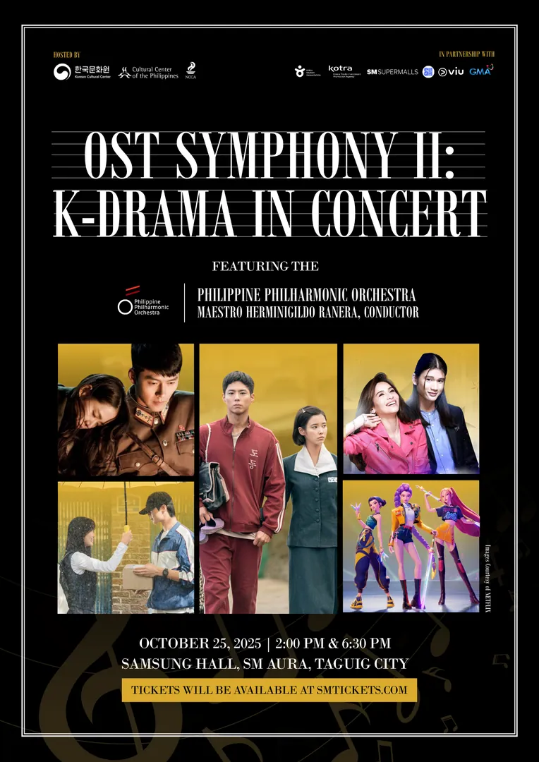 The timeless emotion of Korean drama comes alive once more as the Cultural Center of the Philippines (CCP), the Korean Cultural Center in the Philippines (KCC), and the National Commission for Culture and the Arts (NCCA) present OST Symphony II: K-Drama in Concert on 25 October at Samsung Hall, SM Aura, Taguig City — with performances at 2 PM and 6.30 PM.