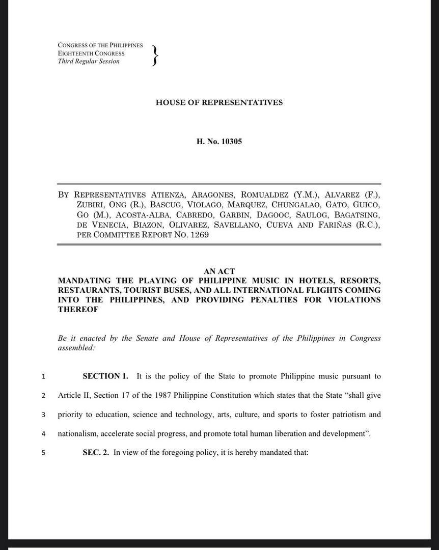 The bill aims to promote nationalism and spotlight "any musical composition, whether purely instrumental or with lyrics, which has been originally composed, written, arranged, performed or played by Filipinos." It aims to attract more tourists to return to the Philippines.