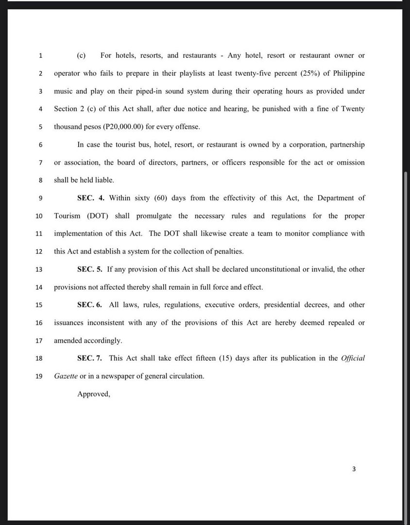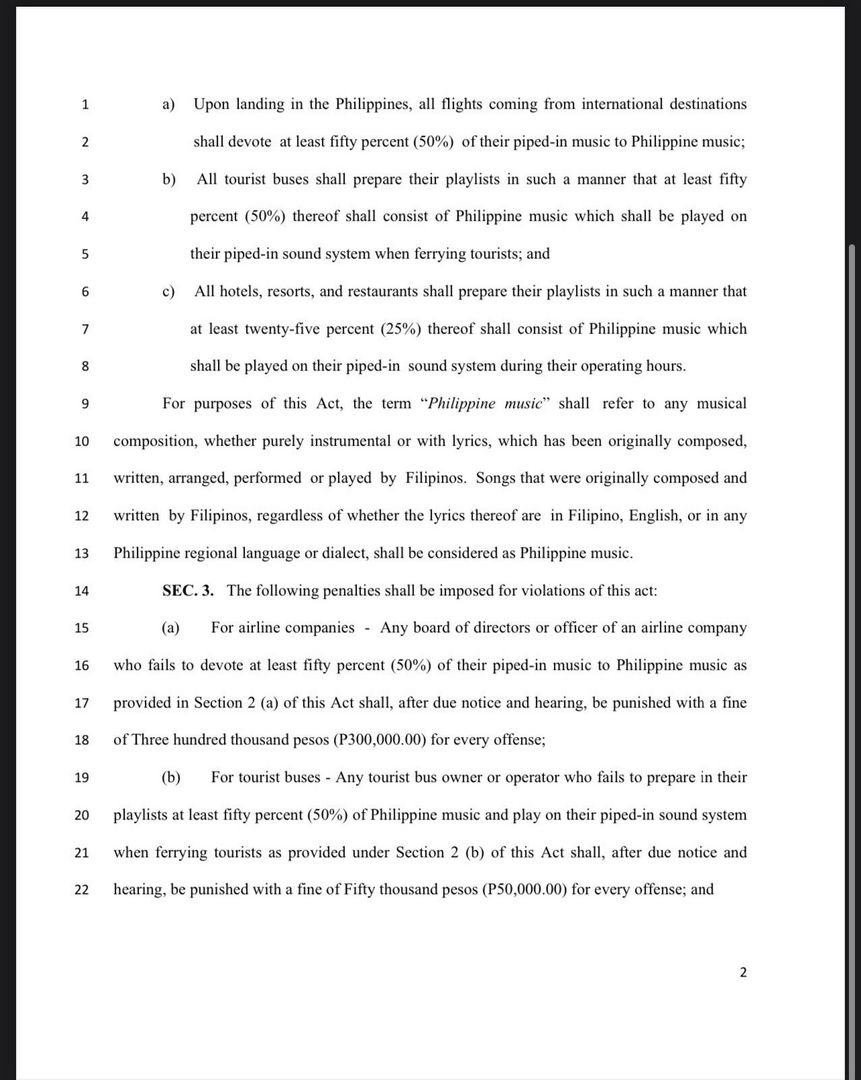 According to the bill, airline companies that fail to play the required music as its aircrafts land in the country face a PHP 300,000 fine. Bus operators will pay PHP 50,000 for every offense, while the fine for hotels, restaurants, and resorts is PHP 20,000 for every offense.