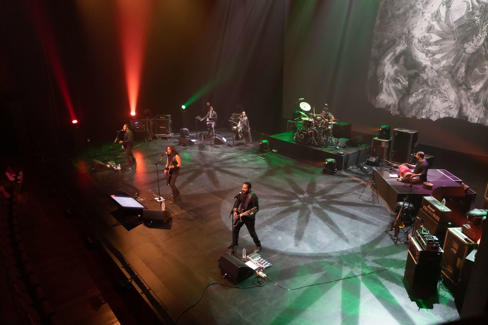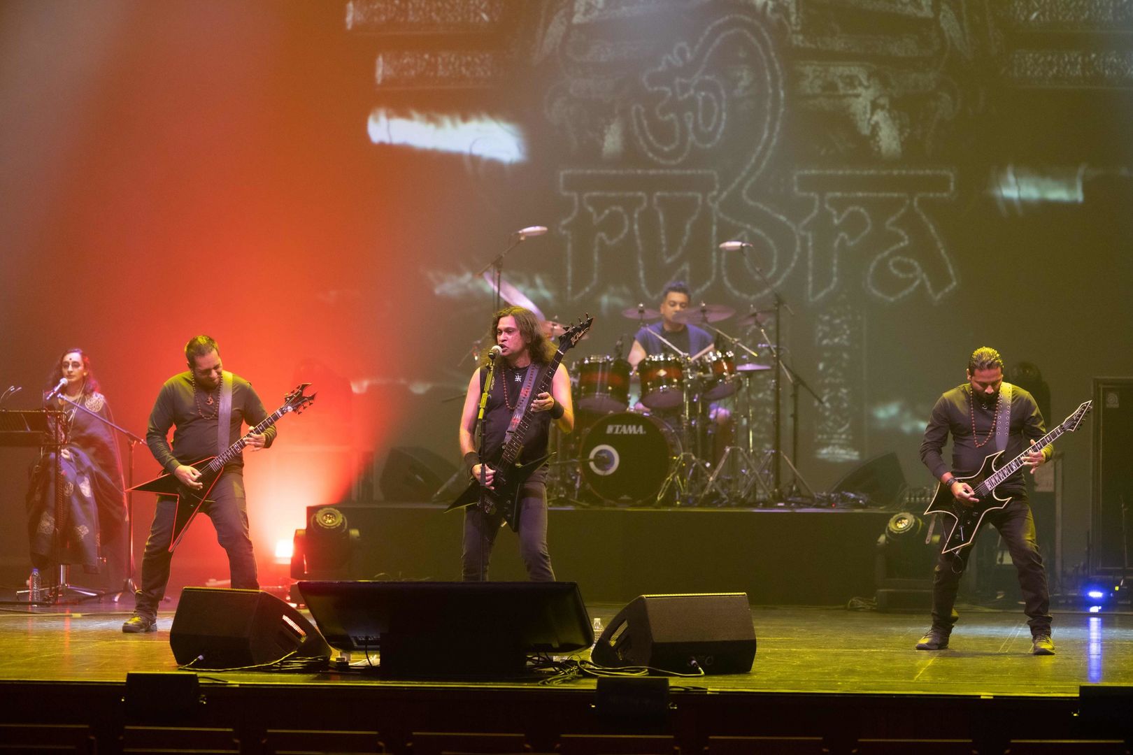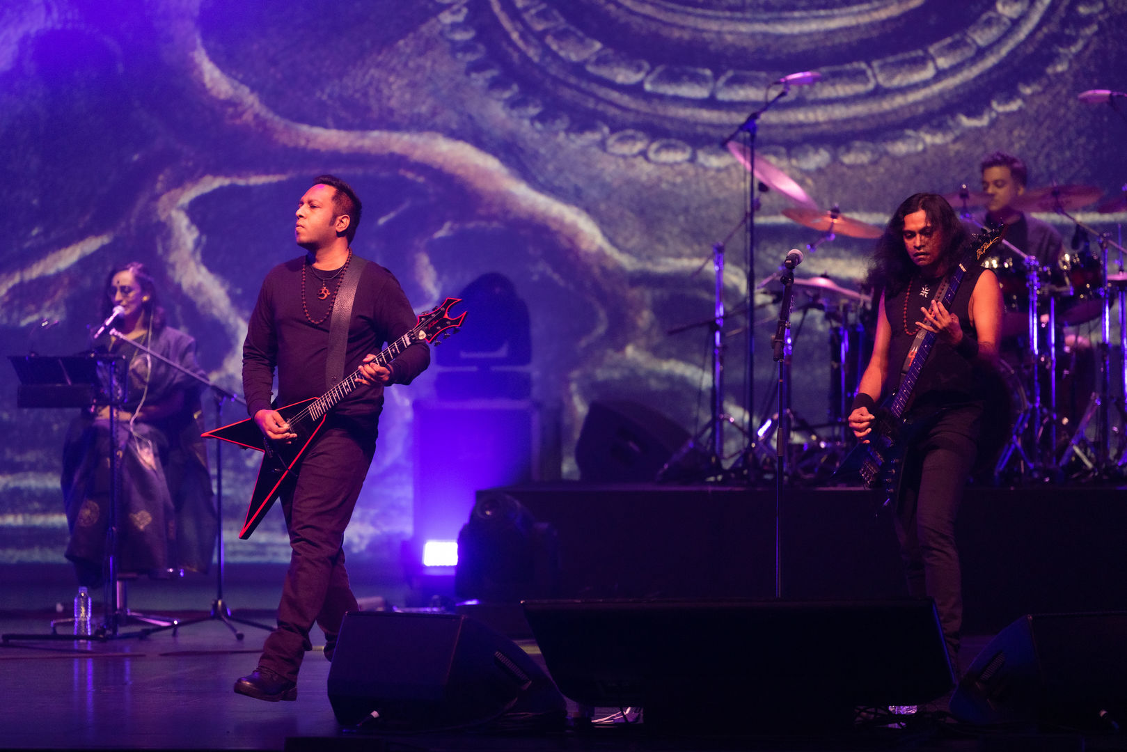 Starting off their set with ‘Death’ from RTA which was inspired by Valmiki’s deeply emotive Ramayana, Kathir wastes no time in going into his highly meditative vocals as soon as the intro kicks in. The flautist Ragha chimes in with a tranquil solo before guitarists Devan and Vinod begin strumming their guitars, and Kathir switches to his raspy snarls. Almost on cue, the green, purple, and orange strobe lights begin flashing, adding to the intensity of the set, and reminding audiences who may have been fooled by the lavish setting of the theatre that, this is, after all, still a no-holds-barred extreme metal gig.