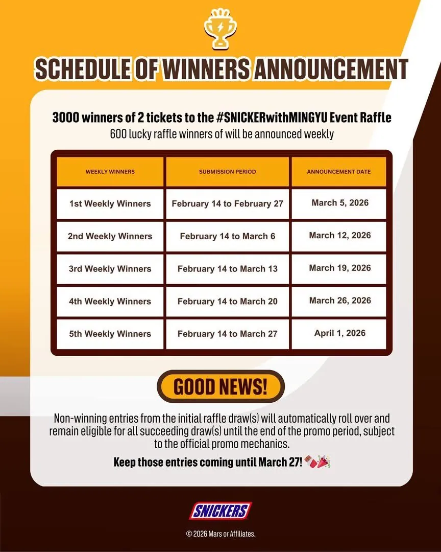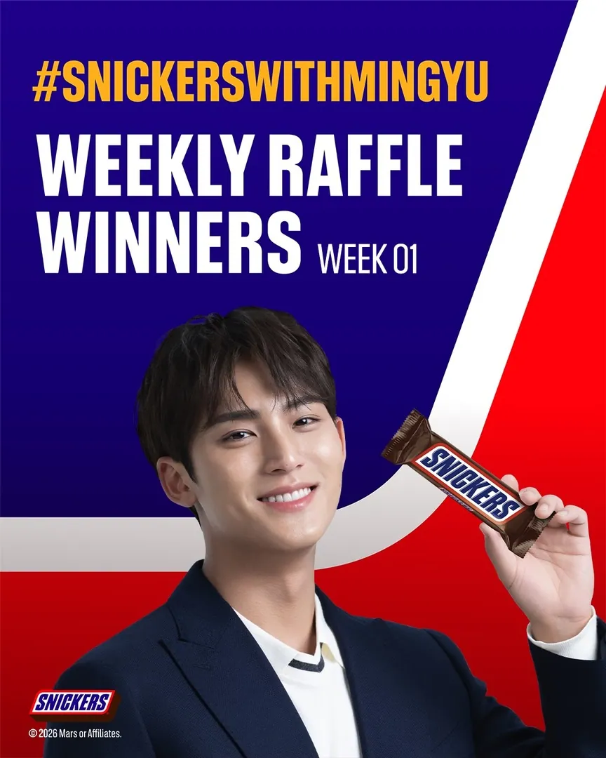 The fan activation gives participants the chance to win tickets through a social media raffle. To join, fans are required to create a photo or video entry featuring SNICKERS and Mingyu displays at participating stores, or a SNICKERS and Mingyu postcard, before posting it on Facebook, Instagram, or TikTok using the hashtag #SNICKERSwithMINGYU and tagging the brand’s official accounts. Participants must then submit proof of their post through an official Google Form to complete their entry.