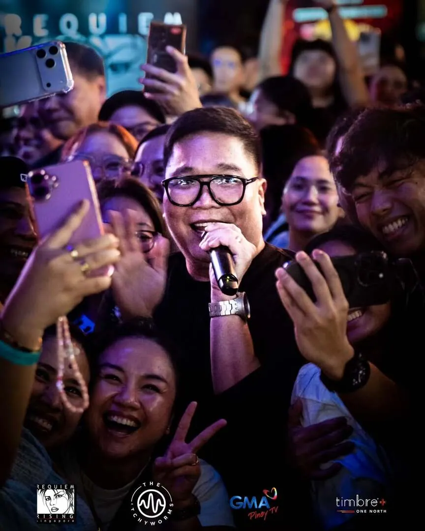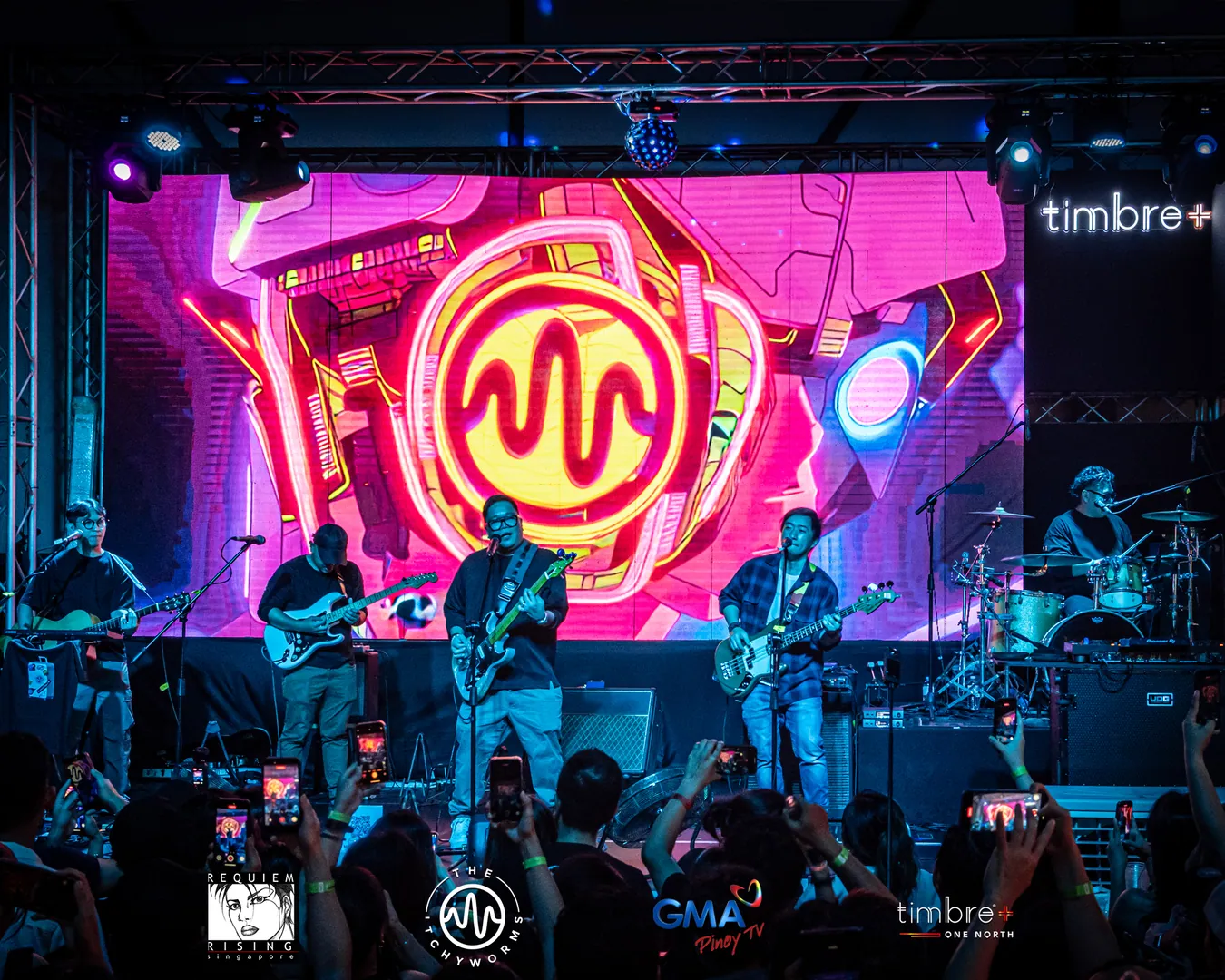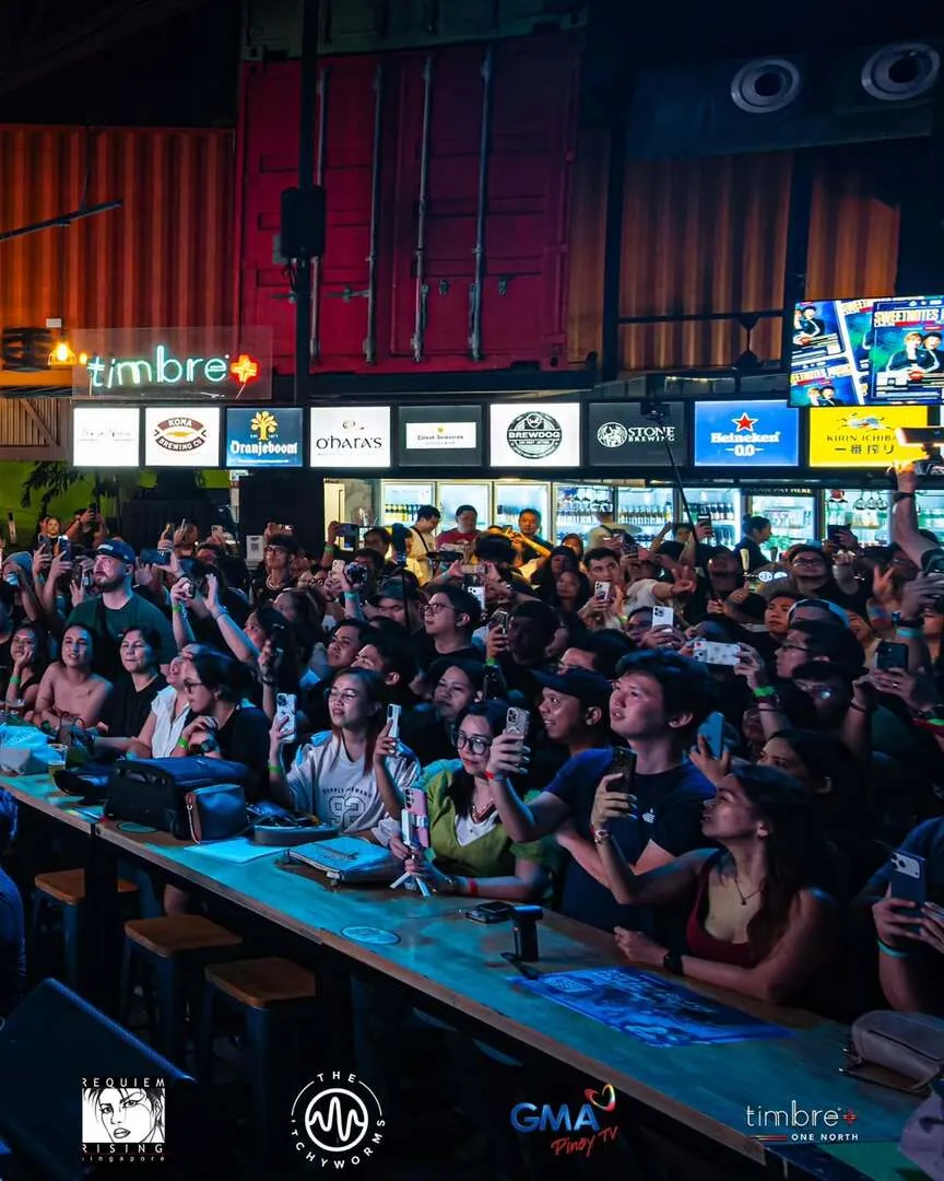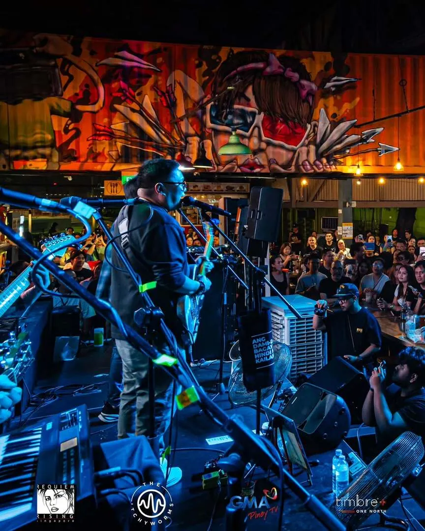 The Itchyworms played their sixth show in Singapore, entitled Akin Ka Na Lang Singapore 2025 to an audience of 600 that filled music venue Timbre+ One North, last Saturday, November 8. And Jazz Nicolas (lead vocals, drums), Jugs Jugueta (co-lead vocals, rhythm guitar), Kelvin Yu (bass guitar), Weckl Mercado (guitar), and Michael Vargas (guitar and keys) were a roaring success. After Singaporean opening act ICEBOX concluded with an impressive and youthful cover of 'Huling El Bimbo', and as director Quark Henares (who directed two music videos of the band, 'Penge Naman Ako N'yan' and 'Freak Out') was DJ-ing the last in-between set, people rushed the front where high tables had been set as a barrier two or three feet from the stage.