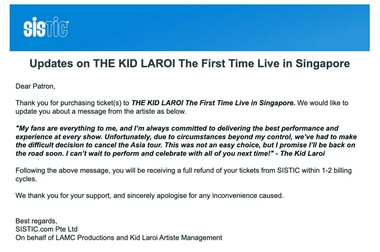 SISTIC has also informed ticketholders that a full refund will be made within 1-2 billing cycles.