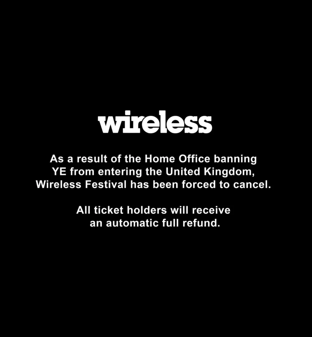 On 7 April, the organisers of the Wireless Festival, Festival Republic, announced that due to West's ban on entering Britain, the three-day festival would be cancelled and refunds would be issued to those who were set to attend.